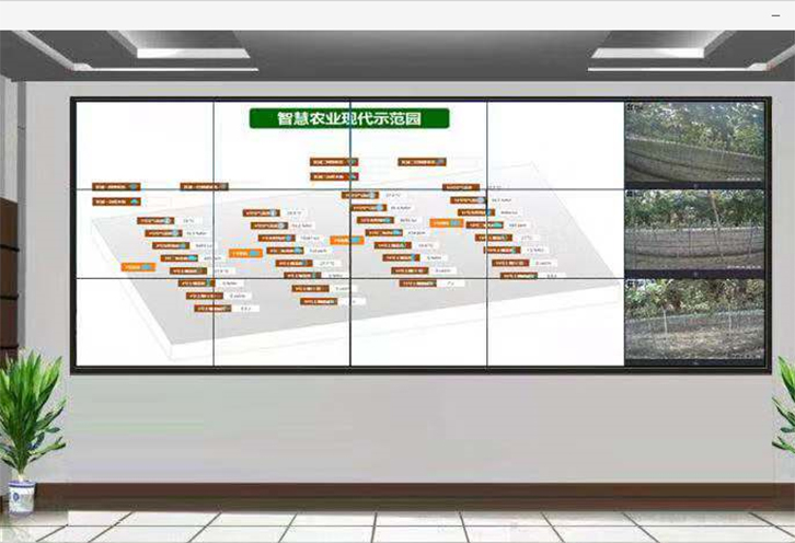 实例概况:智能连栋大棚面积连体棚11.4亩左右:每个跨度长59.4米*宽8米,智能连栋大棚分为两个区域监测及控制;温室智能控制功能系统配置:连栋大棚室内六个监测点,分别监测空气温度、湿度、光照强度,二氧化碳,土壤温湿度电导率,土壤酸碱度等;通过采集设备监测的数据实时上传到云服务器,通过云平台运算分析及联动控制,自动控制现场电机设备,现场设备有顶卷膜,侧卷膜,前卷膜,水肥一体机,自动喷药机等, 控制系统自动调节温室大棚内的环境指标及土壤墒情,确保大棚内环境最适宜基地种植物生长;整套控制系统还包含:视频监控,演示展厅拼接屏.