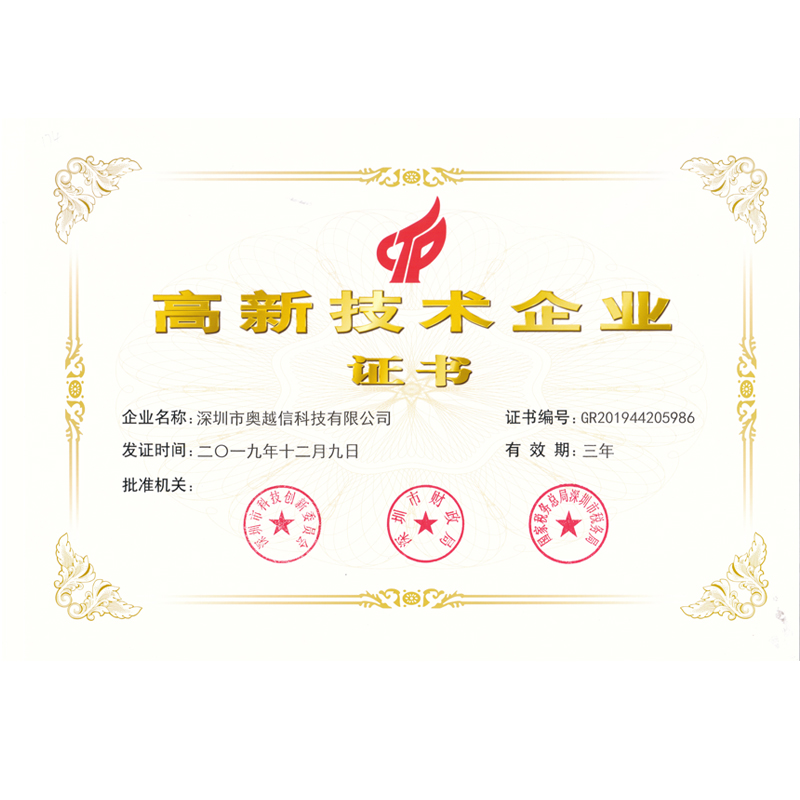 我司已收到了由深圳市科技创新委员会、深圳市财政局、国家税务总局深圳市税务局联合颁发的“国家高新技术企业”认定证书,由此正式迈入国家高新技术企业行列。